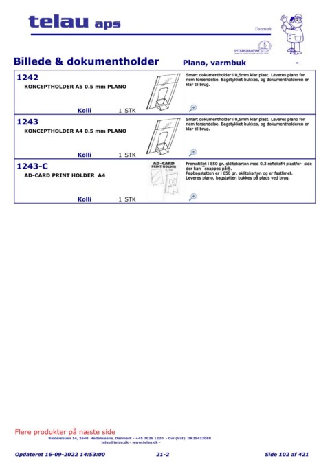 1243 Smart dokumentholder i 0,5mm klar plast. Leveres plano for